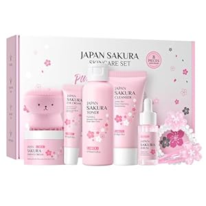 Skin Care Hydration Gifts ,Cherry Blossom Skincare 8-Piece Set for Women ,Cleanser,Toner,Eye Cream,Essence Serum,Hair Clip + Hair Rope + Pink Octopus,Vegan & Cruelty-Free Facial kit