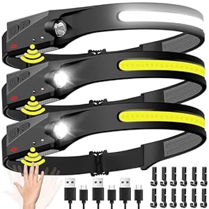 Headlamp Rechargeable 3PCS, 230° Wide Beam Head Lamp LED with Motion Sensor for Adults – Camping Accessories Gear, Waterproof Head Light Flashlight for Hiking, Running, Repairing, Fishing, Cycling