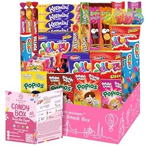 EXOTIC 40 PCS CANDY VARIETY BOX: Discover a delightful 40-piece candy variety box with a burst of juicy blackberry and strawberry jellies, fizzy popping candies, sugared gums, sweet lollipops, milky-filled treats, hard candies, rich buttery toffees, and sugar milk-covered chocolate dragees. A joyful journey through a world of flavors awaits!