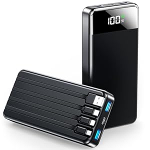 Widely Compatibility Power Bank with Built-in Cables: N6 USB C portable charger has 4 built-in cables (iOS, Type C, USB A, Micro) and 3 Charging ports (USB A 1/2, Type C), compatible with almost all types smart devices on market such as iPhone 16 15 14 13 12 11 Series, XR, XS Max, Samsung S22, S21, S20, A52, A32, Z fold series, Z flip series, and Google Pixel series, and other Android phones, iPad, tablets, etc…