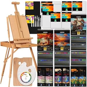 [All IN ONE Professional Painting Kit] Unleash your creative spirit with our painting set! You can start creating as soon as you get it. It includes all the painting supplies you need to start creating right away: beech wood french easel, 96 paints set (Oil, Watercolor, Acrylic), 2 stretched canvases, 6 white & black canvases panels, 6 palette knives, wooden & plastic palette, 3 painting pads, 30 paintbrushes, paint knives, and color wheel.