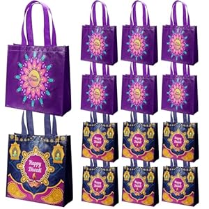 Happy Diwali Party Goodie Bag INCLUDES 12 gift favor bags that are perfect for a festival of lights. Each bag SIZE measures 4.75” length x 2.5” wide x 7” tall. Party Goodie Bags are excellent for small gifts, treats, and other party favors.