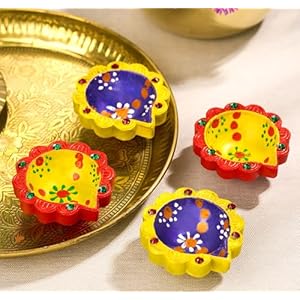 🪔 Pack of 12 | Handpainted Artisanal Diyas: This set of 12 handcrafted Diwali diyas 🪔 for pooja is perfect for Diwali decorations for home and rangoli. These clay diyas for Diwali are hand-painted by women artisans from Gujarat, India, featuring traditional kundan art using cones and intricate handwork. These Diwali diyas will brighten up your festive spirits and enhance your Diwali decor and Diwali decorations for home.