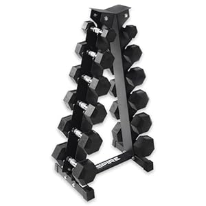 INCLUDES RACK & 6 PAIRS OF DUMBBELLS: A-frame dumbbell storage rack comes with pairs of 5, 10, 15, 20, 25, and 30 lb dumbbells