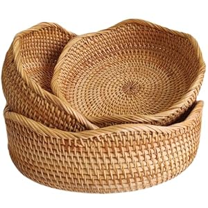 Rattan Bread Basket, Hand Woven Fruit Basket, Wicker Serving Basket Bowl, Decorative Baskets for Kitchen Counter Organizing, Set of 3 (Wave)