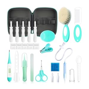 Baby Essentials for Newborn: 26 in 1 baby grooming kit includes baby nail clippers, baby nail file, Newborn hair brush, Babies comb, finger toothbrush, tweezer, nasal aspirator, baby scissors, Ear Cleaner, medicine dropper, Alcohol prep pads and measuring spoons(ml). This 26 in 1 grooming kit can be used for our newborn baby’s daily needs.