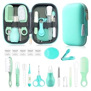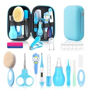 18 in 1 Baby Grooming Kit: The package comes with the baby grooming kit, including baby nail file, Newborn hair brush, Babies comb, finger toothbrush, tweezer, nasal aspirator, baby scissors, medicine dropper,portable blue EVA bag, Alcohol prep pads and measuring spoons(ml).This 18 in 1 grooming kit can be used for our newborn baby’s daily needs.