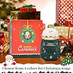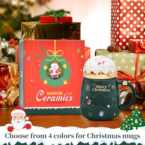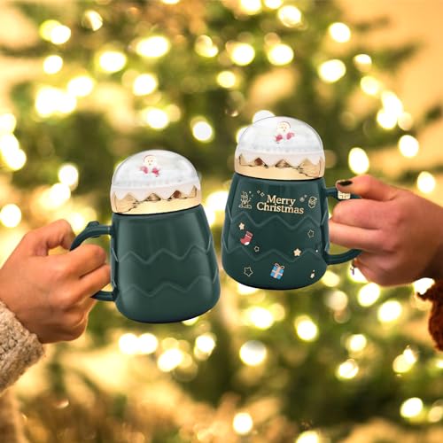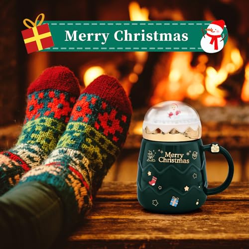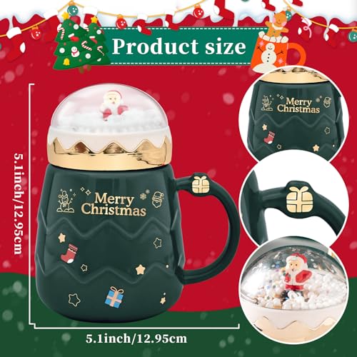 Peclek 17.6 oz Christmas Mug with Winter Snow Globes Lid Decorations, Large Cute Festive Ceramic Coffee Cup, Winter Xmas Holiday Birthday Tabletop Drinkware Gifts for Adults Kids Men Women (Green)