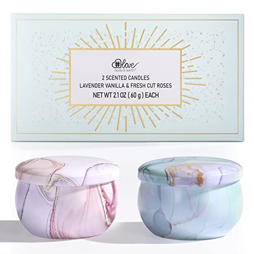 Candles for home scented: This scented candles gift set includes 2 tins of scented candle: Lavender Vanilla & Fresh Cut Roses, The natural essential oils will leave you feeling calm refreshed and relieved of stress