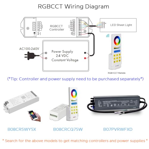 Product Description: This low voltage 24V flexible led sheet light adopts 24*12 5-in-1 RGBCCT 5050 LED layout, ultra-thin design, can be cut-to-size, suitable for large area applications such as backlit lighting. Easy to install with adhesive backing. Specifications: Type: Flexible LED Sheet LED Chip: SMD5050 Input Voltage: DC24V Current: 2.5A/roll Power: 60W max Size: 9.5″x19″ (240mm*480mm) LED Quantity: 288LEDs Lumen: 35lm/LED at full output LED Color: RGB+CCT Color Temperature: 2600K to 6500K Cut Length: 4.72″x1.57″ (120mm*40mm) PCB Color: White CCT CRI: Ra90 Beam Angle: 120 Waterproof Rating: IP20 non-waterproof Lifespan: 50,000+hours Working Temperature: -20℃+45℃ Storage Temperature: -20℃+60℃ Applications: Backlit Lighting Acrylic Table Lighting Accent Lighting Large Flat Area Lighting Package List: 1x 16.4Ft LED Strips Note: This link does not contain any power supply and controller, please purchase the following link Remote Kit: s://./dp/B08CRCQ75W/ WiFi Controller: s://./dp/B08CR5WY5X/ 24V 200W power supply: s://./dp/B07PVRWFXD/