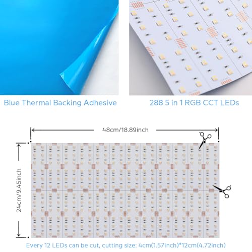 19″x9.5″ Flexible LED Panel Sheet RGBCCT 5in1 Color Changing Ultra Thin Cuttable 90W 2.5A 24V LED Light Sheet RGBWW 2600K~6500K, Adhesive Backing, 288LEDs (RGB+CCT(2600-6500k))