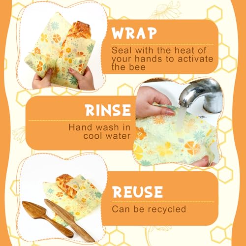 Effortless Usage and Reusability: these beeswax food storage wraps simply require heating the plastic wrap by hand to make it pliable and shapeable to fit your specific food storage needs; These beeswax food storage wraps are reusable, just rinse off leftover food with a sponge, wipe gently with a small drop of mild soap in cold water ( avoid hot water) , then air dry ( do not wring out) and you are ready to use again