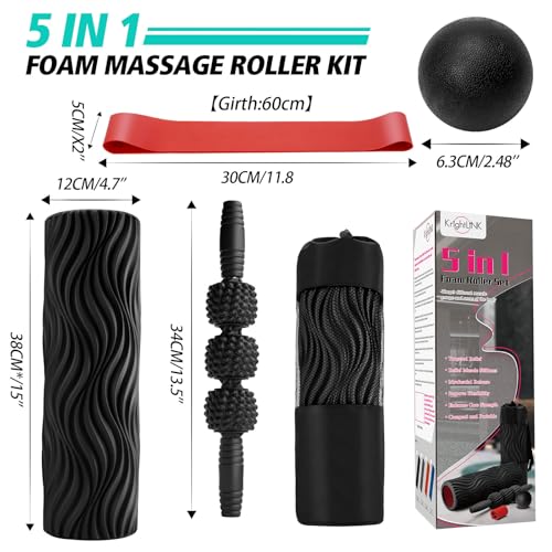 Krightlink 5-in-1 Foam Roller Set, Massage Roller Stick, Massage Ball, Resistance Band for Deep Muscle Massage, Trigger Point Release, Pilates, Yoga (Black-Wave)