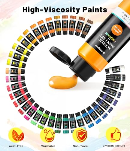 Premium Quality Pigments: This acrylic paint set features 36 vibrant colors, each with a 60ml volume. Made with high-grade pigments, these art paints offer intense color saturation and exceptional opacity. They provide smooth and consistent coverage, ensuring vivid, true-to-tone hues. The colors are blendable and mixable, allowing for a wide range of creative possibilities. Designed to resist fading, these paints maintain their brightness over time, making them perfect for eye-catching projects