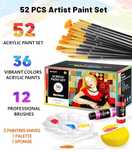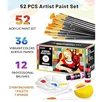 Deluxe Artist Paint Set: Our 52 pieces acrylic paint kit includes 36 vibrant colors acrylic paints, 12 high-quality brushes, 2 mixing knives, 1 art sponge and 1 palette. All these essentials come neatly packed in a beautifully designed, sturdy gift box, ensuring your paint supplies are organized and protected. Whether for professional use or as a thoughtful gift, it’s perfect for both seasoned artists and beginners, ensuring a complete and organized artistic experience