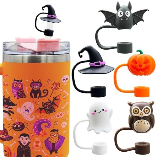 5PCS Halloween Straw Toppers for Stanley Cup, Silicone Straw Topper, Straw Covers Cap for Stanley 30&40 Oz Tumbler with Handle, 10mm 0.4in Dust-Proof Reusable Straw Tips Lids for Halloween Gifts