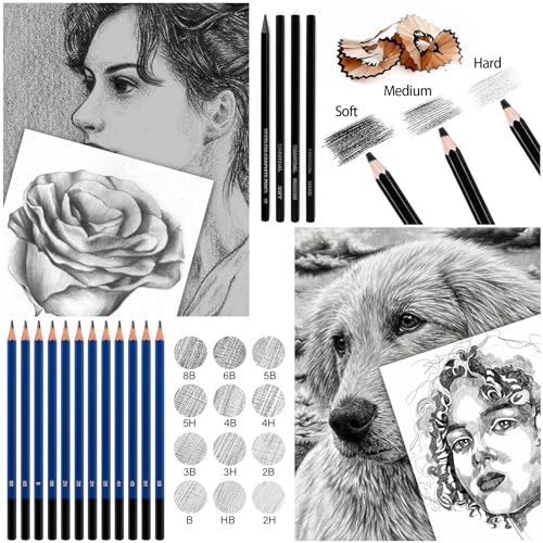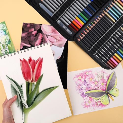 Professional Drawing Supplies Set:Our Painting and Sketching Kit contains: 48 Colored Pencils, 12 Sketch Pencils, 3 Charcoal Pencils (Soft/Medium/Hard), 1 Graphite Pencil, 3 Blending Paper Stumps(Large/Medium/Small), 1 sandpaper block, 1 Dual Head Pencil Extender, 1 Rubber Eraser, 1 Sharpener, 1 A5 Sketchbook, all in Zipper Case