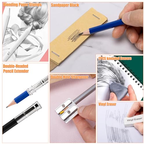 【Professional and Complete Drawing Sketching Set】 Drawdart’s 76 pack art supplies kit is perfect for both beginners and professionals with its comprehensive collection of high-quality drawing tools. This set comes with various pencils, blending tools, erasers, sharpeners, and more, providing everything you need to unleash your artistic talent. These drawing pencils include 3 White Charcoal Pencils, 6 Black Charcoal Pencils, 2 Colored Charcoal Pencils, 12 Watercolor Pencils, 12 Oil Based Colored Pencils, 12 Wooden Graphite Sketching Pencils, 12 Metallic Coloring Pencils, 1 Woodless Graphite Pencil 6B. Perfect for drawing, sketching, shading, layering, blending, and more.