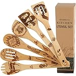 – TOTAL 6 pcs OF MAGICAL WIZARD WOODEN BAMBOO KITCHEN UTENSILS – PERFECT GIFT – This 6 pcs Set Of Magical Wizard Kitchen Utensils Set Comes All Packed In A Stylish Gift Box – Perfect For House Warming Present – Hostess – Mother’s Day – Birthday – New Year – Christmas – Halloween – Wedding Gift Or To Anyone Who Loves To CookPARTY – Just Think Of This – It Will Make An Excellent Conversation Piece At Every Party! – A Creative And Unique Gift, Not Just Another Boring Present That Gathers Dust MODERN DESIGN – Add A Unique And Stylish Touch To Your Home And Kitchen With This Modern Bamboo Utensils Set – 3D Embossed Engraved Patterns – Hanging Hole Design Save Your Kitchen Space – Easy To StoreNATURAL ENVIRONMENT FRIENDLY – Natural And Organic Hand Crafted Bamboo – Practical Sturdy And Durable Material – Natural Oil Finish – Non Stick Durable BambooMULTIPURPOSE – Complete Cooking And Serving Utility – Perfect For High Heat Sauteing, Baking, Mixing, Flipping, Decoration – Easy Care Conveniance – Practical Design And Functionality – Smooth And Comfortable HandleWHAT COMES IN THE PACKAGE: 1 Forked Spoon 1 Slotted Spoon 1 Spoon Spatula 1 Rounded Spoon 1 Spatula 1 Slotted Spatula – Everything Packed In A Stylish Gift BoxHOW TO MANTAIN THE BAMBOO SPOONS 1. Hand Wash With Soap, Warm Water And Wipe Dry. 2. Prolonged Soaking Is Not Recommended. 3. Not For Use In A Microwave Or Dishwasher.NOTE: ►1. Keep your wooden spoons stored in a well-ventilated, clean location ►2. Soak them in olive oil and allow the oil to soak into the wood for about 1 day before you use them. The oil keeps them from staining and absorbing sauces and they will gild your kitchen for a long time to come