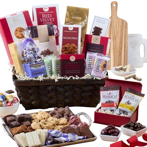 Gourmet treats include chocolate caramels (4.4 oz), dark chocolate sea salt cashews (2.3 oz), assorted chocolates (4 pieces), sea salt chocolate caramels (5.2), chocolate chip cookies (4 oz), assorted chocolate truffles by Lindt (5.1 oz), red velvet cookies (5.5 oz), chocolate dipped peanuts (3 oz),