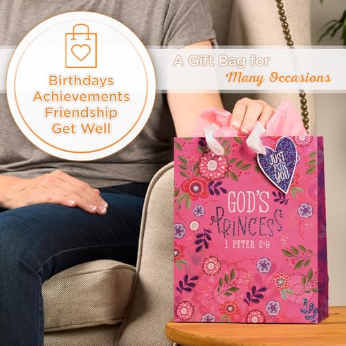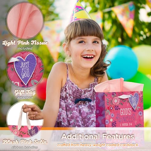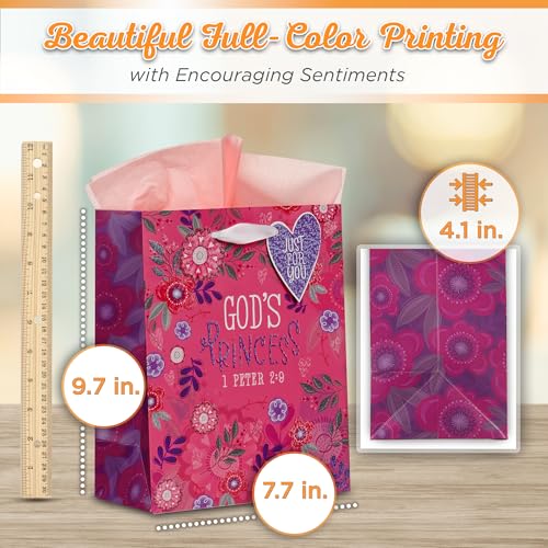 Paired All-in-One Presentation: Coordinating light pink tissue paper and multicolor dark purple heart tag for writing a message make gifting more simple. Elegant, snow white satin ribbon handles add to the polished appearance of this colorful gifting bag making it a great choice for a child or pre-teen’s birthday. She will appreciate the bag’s inspiring, floral glitter design with the Scripture inspired sentiments “God’s Princess” on the front and “Chosen, Loved, Beautiful” on the back.