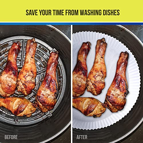 ✔️[FREE FROM HARMFUL SUBSTANCES] This product does not contain seven harmful substances including: cardboom, zinc, lead, phenol, fluorescent whitening agents. A durable French AHLSTROM origin is used for this air fryer parchment paper sheets.