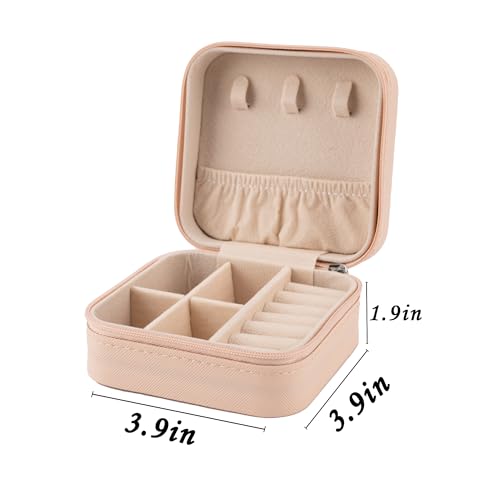 Protable Travel Jewelry Box: This travel jewelry case organize measures 3.9*3.9*2inch/10*10*5cm. There are 6 ring placement, 4 stud earring compartments, 3 necklace hooks, and 4 rectangular divisions which can be removed. This small jewelry box is a best travel jewelry case organizer.