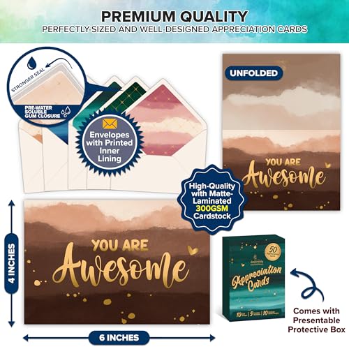 IDEAL FOR ALL OCCASIONS – Express appreciation in different ways with these appreciation note cards & work appreciation cards. You can use them as recognition cards, you’re awesome cards, grateful for you cards, or gratitude cards with envelopes.