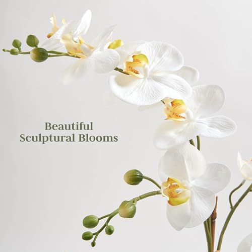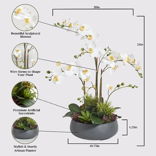HIGH-QUALITY MATERIALS: The durable grey colored pot and beautiful lifelike white orchid blooms combined with foilage and succulents with wire stems will shape your plant as desired for years to come.