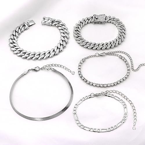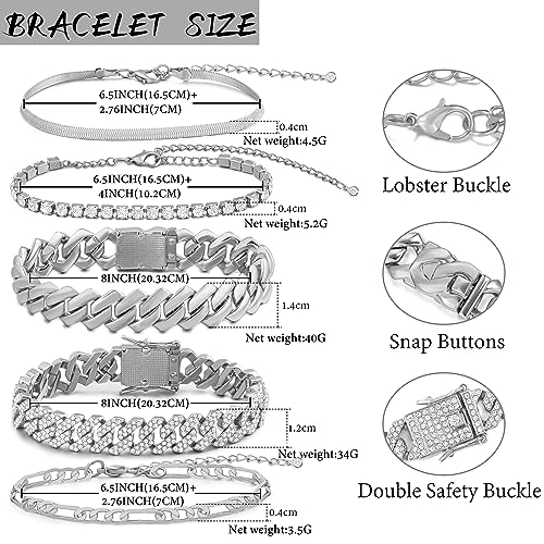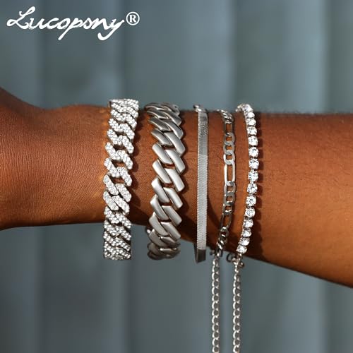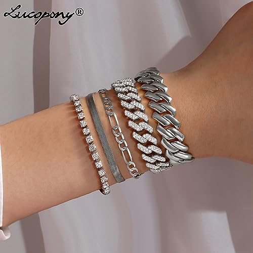 Lucopsny Gold Bracelets for Women, 14K Gold Plated Bracelets Sets for Women, 13mm/14mm Cuban Chain Bracelet Layered Link Chain Bracelets Pack Jewelry Full Diamond for Women