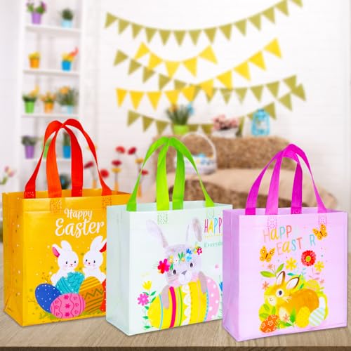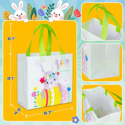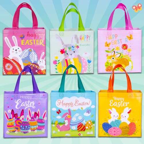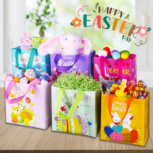 Happy Easter Gift Bags with Handles, Bunny Carrot Chick Designs, Reusable Non-Woven Treat Bags for Party Favors, Gift Wrapping, Easter Basket Container, 9.1Ã8.7Ã4.5 inch, 6-Pack