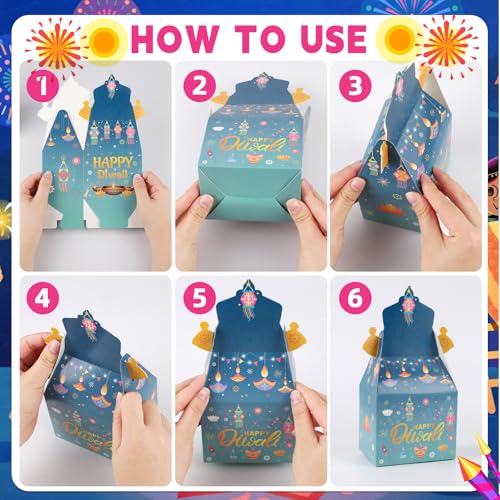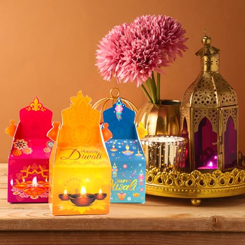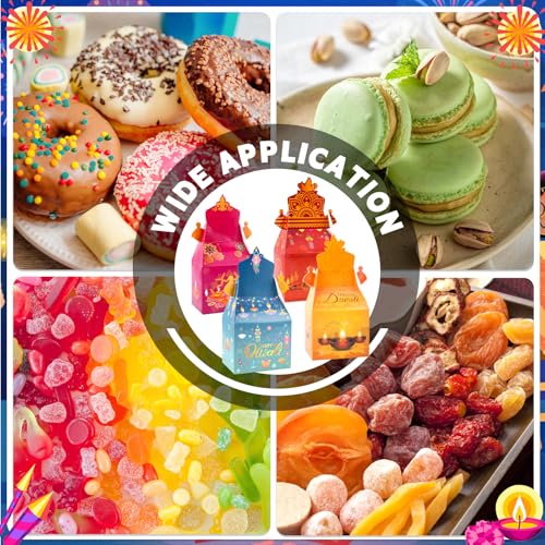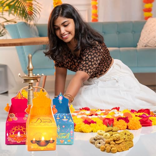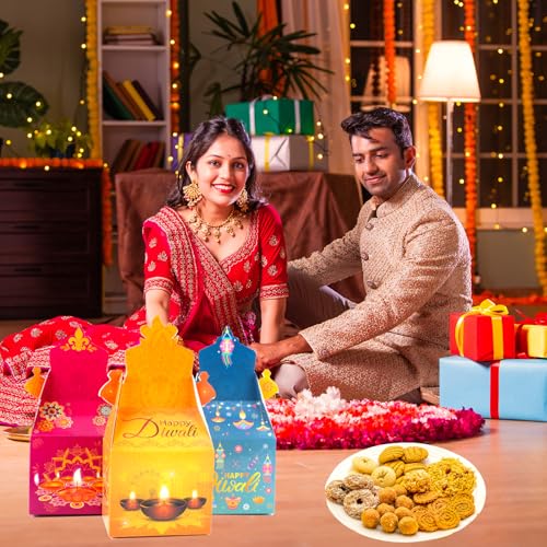 Premium Diwali Diya Treat Boxes Material: These Festival of Lights treat boxes are made of high-quality paper, which is durable, sturdy and not easy to tear. Diwali gift boxes are food grade material, non to xic and no smell, safe for snack store!