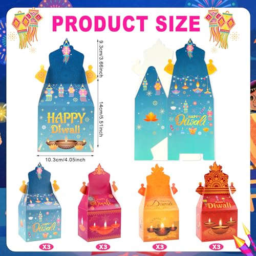 Happy Diwali Gift Boxes Include: You will receive 12 pieces Deepavali candy boxes in 4 different styles for Indian Festival of Lights party decorations, each box is designed to evoke the spirit of Diwali and make your gifts extra special.