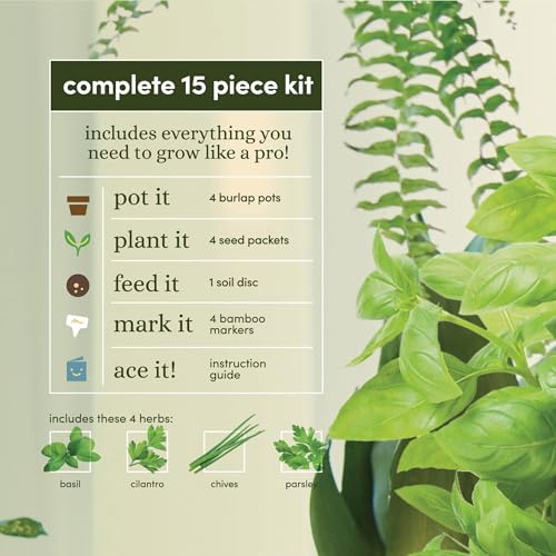 EVERYTHING YOU NEED TO EASILY GROW 4 CULINARY HERBS AT HOME, IN ONE SLEEK BOX: 4 durable burlap pots, 4 moisture-proof seed packets, 1 soil disc that expands when watered to fill all four pots, 4 beautiful bamboo plant markers, pruning shears and a beautiful, comprehensive instruction booklet. Grow the following 4 tasty herbs: Basil, Cilantro, Chives and Parsley.