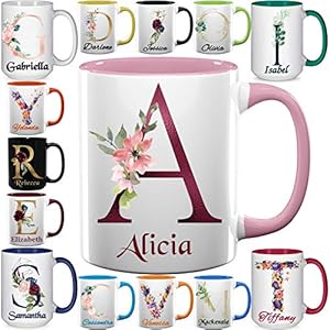 Custom Coffee Mugs – Personalized Ceramic Cups with Initial Letter Name Monogram – Customized Floral Mugs Gift – 11 & 15 oz