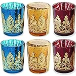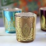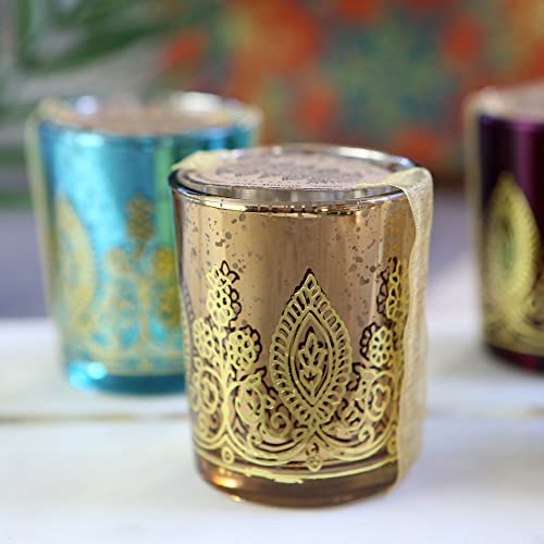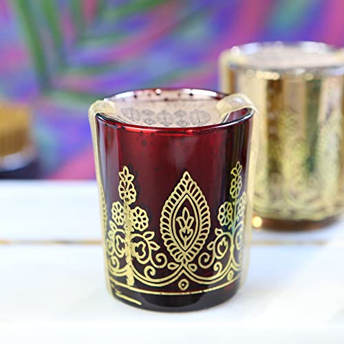 Create a warm, welcoming, and jewel toned atmosphere with mercury glass votives in sapphire, amethyst, ruby and citrine. Perfect for Indian bridal showers or weddings, beautiful colors decorated with metallic gold henna print shine and shimmer, creating the right atmosphere for an elegant celebration. Give these away to your guests, family and friends as party favors so they can remember that wonderful day with a warm light in their hearts. A tealight is included for each votive, and each glass measures 2.5 inches high and 2 inches in diameter. We do not recommend serving food from these glasses.