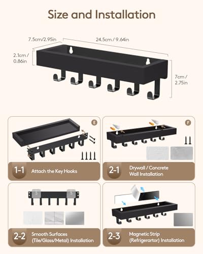 Key Holder with Multiple Installation Options: Whether you favor wall mounting, damage-free adhesive, or magnetic options, our key hooks let you choose the setup that best suits your needs. Installation is super easy.