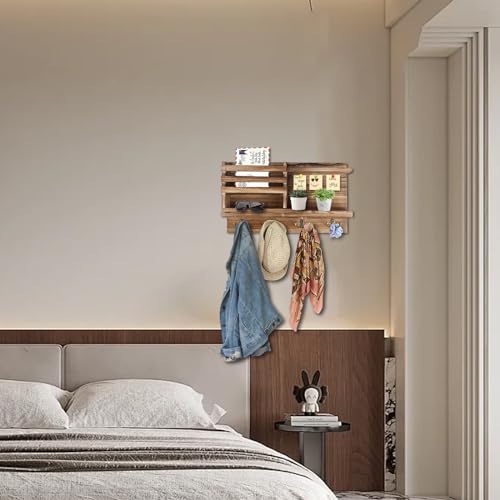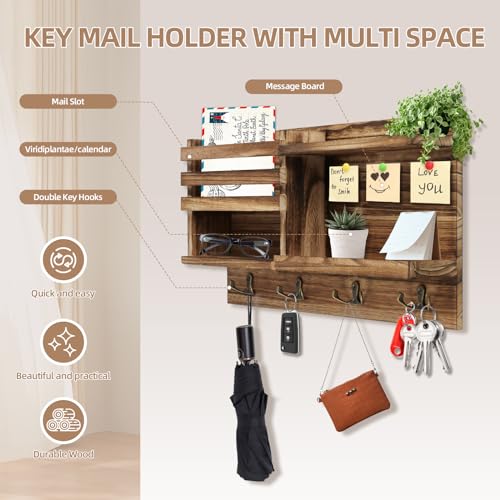 Key Holder Wall Mount, Solid Wood Key and Mail Organizer for Wall(Self Adhesive or Drill), 8 Hooks Key Rack for Entryway Hallway Bedroom Farmhouse Home Decor (Burnt Brown)