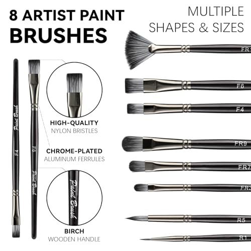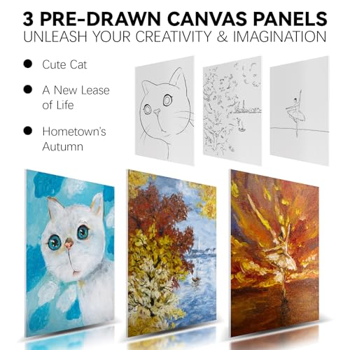 【Rich Contents Painting kit】: Professional Premium Paint Set includes 18 colors of acrylic paint (22 ml, 0.74 oz), 8 brushes, 3/ 8X10 blank canvas boards, 3/ 8X10 pre-printed canvases boards, 8X10 painting pad(15 sheets), multifunctional tabletop wooden easel, plastic palette, cleaning cup, cleaning cloth, painting guide etc painting supplies. Meet all your painting supplies needs.