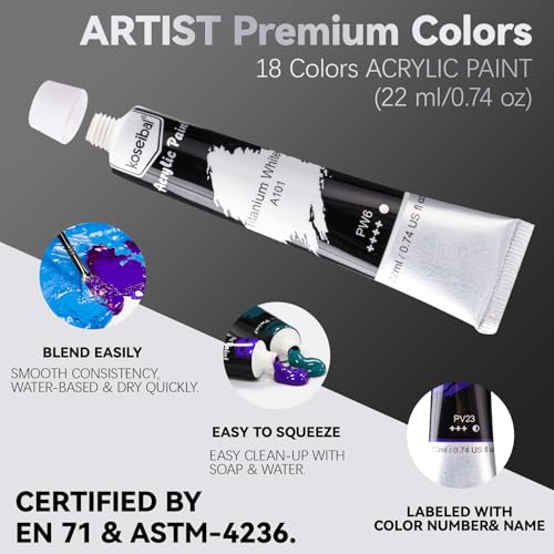 【22ml Acrylic Paints】: Our acrylic paints set offers 18 kinds of colorful heavy body acrylic paints. 22ml, 0.74OZ. These high quality paints produce realistic and consistent hues in the art of painting. Safe and non-toxic to use, the super rich colors make your creations more interesting. They have the characteristics of a professional artist and are great for blending, overlaying and creating textures.