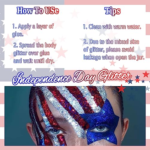 Multi-Color Suit: The 4th of July glitter set include red, white, and blue sequins, which is perfect for Olympic Games, Independence Day/Flag Day/Veterans Day/Presidents’ Day and other patriotic events of the USA. Each set has 2 jars of body glitter and a stick of glitter primer.