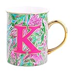 Lilly Pulitzer Initial Ceramic Coffee Mug, 14 Oz Tea Cup, Cute Mug with Gold Handle and Gift Box, K (Coming In Hot)