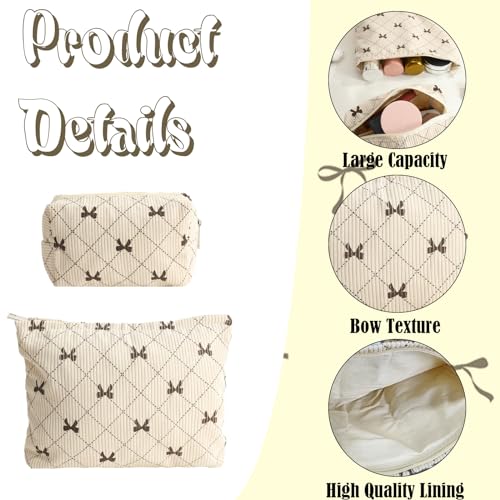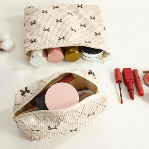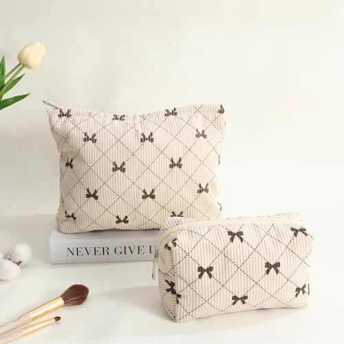 LYDZTION 2PCS Cute Corduroy Makeup Bag Set for Women, Small Travel Toiletry Bag, Coquette Cosmetic Pouch With Bow, Portable Versatile Zipper Pouch – Khaki