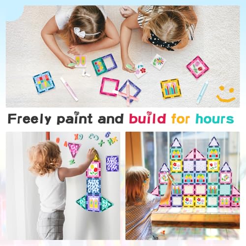 【STEM MONTESSORI & SENSORY TOYS】Magnetic tiles are open-ended play toys that merge STEM learning seamlessly, providing a hands-on learning experience .These magnet toy inspire joy while cultivating autonomous learning and problem-solving skills.With colorful shapes and DIY painting, they enhance sensory development, color recognition, confidence, creativity, and social abilities. This toy is a great montessori learning choice for toddlers and 3+ kids and also parent approved sensory toys for kids with ADHD / ASDs.