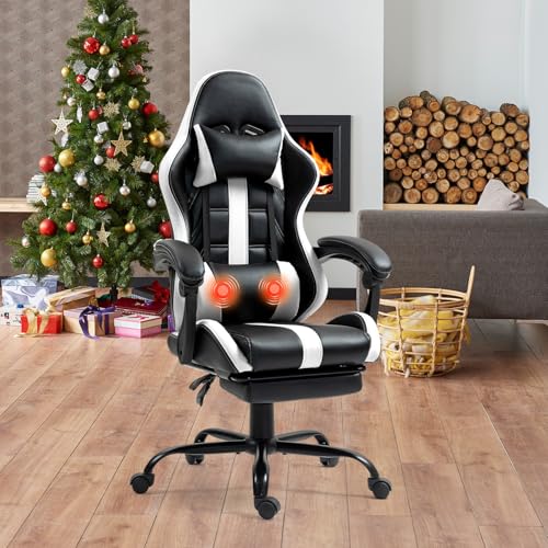 HOMHUM Massage Gaming Chair with Footrest, Ergonomic PU Leather Computer Chair w/Headrest and Lumbar, Height Adjustable, 360° Swivel Desk Office Chair, White