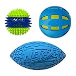 NERF DOG THREE TOY GIFT SET: This set includes a 3.8in Rubber Checker Crunch Ball, a 2.7in Translucent TPR 3-Part Spike LED and Squeak Ball, and a 6in Rubber Tire Squeak Football