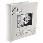 Keep a remembrance of all the special moments of your big day with this “Our Wedding” Album. The beautiful, hardcover album features an elegant silver foil stamp on white faux leather. The cover also showcases a 4.5â x 3â opening for a 5â x 3.5â photograph which easily slides in from the inside cover. This book-bound album is a great way to display your photos and caption each memory with included memo writing areas on each page. Holds 160 horizontal photos. A CD storage pocket on the inside of the back cover conveniently holds 1 CD. Preserve your wedding memories with Malden International Designs sentiment albums.