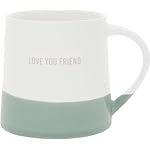 Express your appreciation for your dearest friend with this 17 oz beaker-shaped stoneware mug, featuring a comfortable rounded-edge handle, a matte off-white exterior, and a glossy off-white interior complemented by a vibrant 1/3 hand-dipped green-colored bottom that’s unique to each piece. A tan debossed “Love You Friend” sentiment on the upper half of the front adds a heartfelt touch to this modern, simplistic mug, making it a perfect addition to any drinkware collection. It serves as a delightful gift that will brighten your friend’s mornings, making her smile as she enjoys her favorite coffee or tea. With dishwasher and microwave-safe attributes, Prop 65 approval, and secure packaging in a die-cut box, it guarantees both convenience and safety. Discover Pavilion’s extensive range of styles, with over nine options, including matching kitchenware, home décor, and jewelry, to satisfy all your gifting needs.