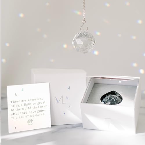 ALL HANGING COMPONENTS INCLUDED: Each Memorialight Pet Sympathy Gift includes everything you need to hang your remembrance crystal. One 18-inch chain, one 3/4″ drywall hanger, and one nail are included in each gift box – making it easy to hang your memorial sun catcher quickly when received, creating a visual remembrance for your dog or cat that beautifully complements any home décor.