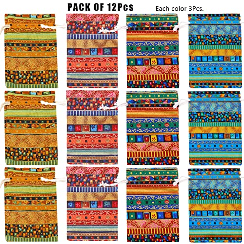 PINOWU Ethnic Style Drawstring Gift Bag 5×7 Cotton Reusable Pouches (12pcs) Jewelry Coin Storage Pouch Eco-Friendly Sachet Bags for Candy Wedding Party Valentine Favors